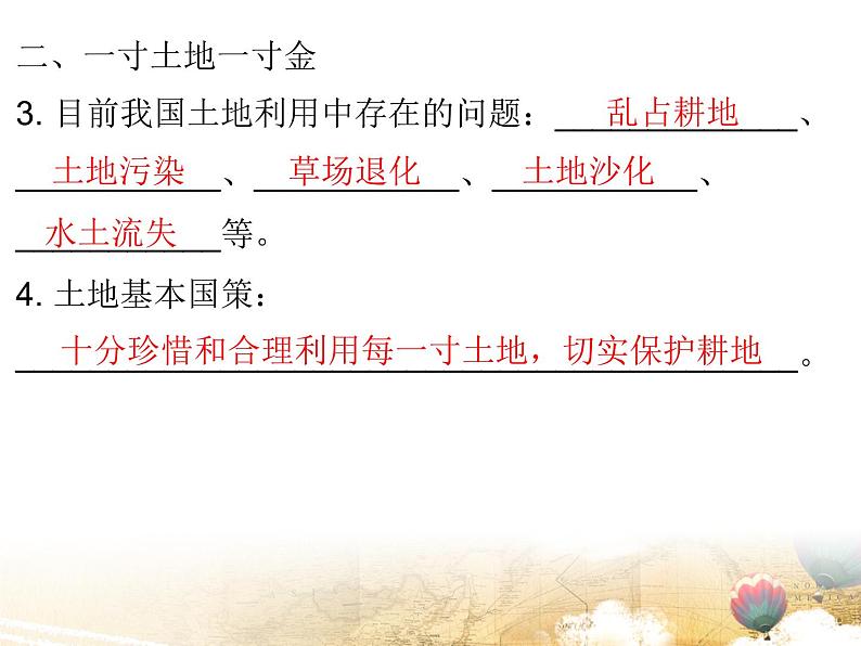 二、一寸土地一寸金3. 目前我国土地利用中存在的问题:_____________、___________、___________、___________、___________等。4. 土地基本国策:__________________________________________。
