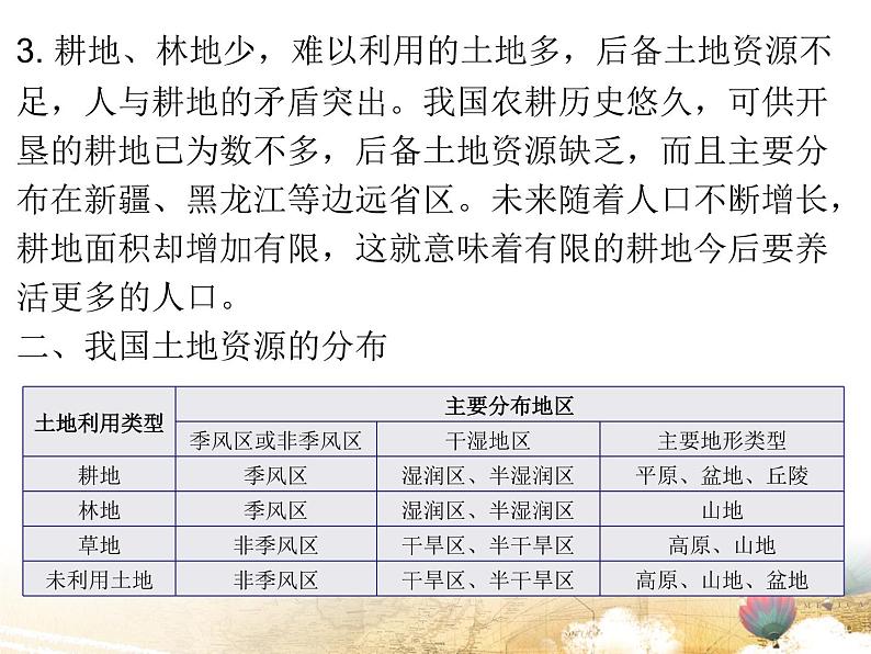 3. 耕地、林地少,难以利用的土地多,后备土地资源不足,人与耕地的矛盾突出。我国农耕历史悠久,可供开垦的耕地已为数不多,后备土地资源缺乏,而且主要分布在新疆、黑龙江等边远省区。未来随着人口不断增长,耕地面积却增加有限,这就意味着有限的耕地今后要养活更多的人口。二、我国土地资源的分布