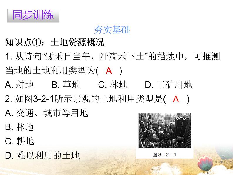知识点①:土地资源概况1. 从诗句“锄禾日当午,汗滴禾下土”的描述中,可推测当地的土地利用类型为( )A. 耕地B. 草地C. 林地D. 工矿用地2. 如图3-2-1所示景观的土地利用类型是( )A. 交通、城市等用地B. 林地C. 耕地D. 难以利用的土地