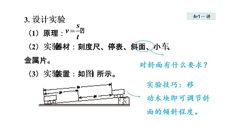 3. 设计实验(1)原理:(2)实验器材:刻度尺、停表、斜面、小车、金属片。(3)实验装置:如图1 所示。