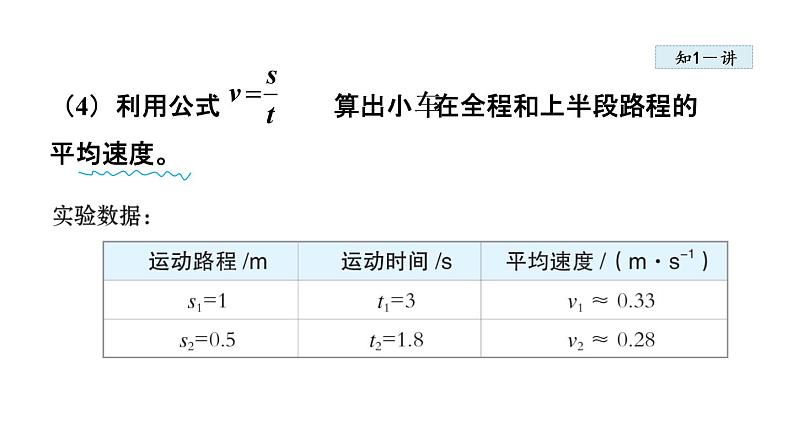 (4)利用公式 算出小车在全程和上半段路程的平均速度。