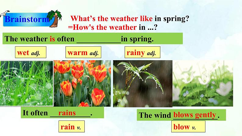 In spring, it starts t get warm. The wind _____ gently. ___________ turns green. It is exciting t ____ ___ ____. The sun _____ brightly in summer. It is nice t ___ ___ ___ ______ in autumn because the weather is cl and ____. It is ften cld and _____ in winter. Children lve t _____ ________. Peple usually ____ time with their _______ _______ the Spring Festival.
