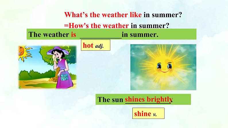 Hw’s the weather in spring? It’s raining and warm. Hw’s the weather in summer? It’s sunny, ht, ht, ht.What’s the weather like in fall? It’s cl, cl, cl.What’s the weather like in winter? It’s snwing, cld, cld, cld.