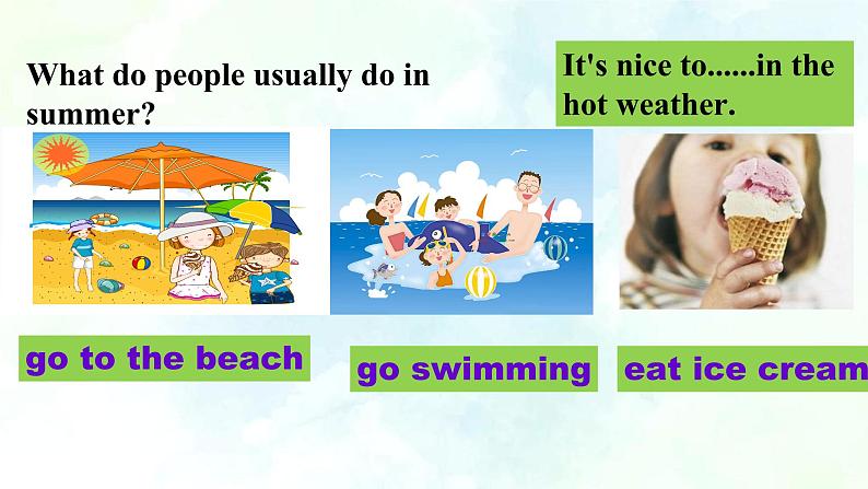 start t d sth./ding sth.开始做某事 turn/get/becme green变成绿色 take a trip 去旅行 g t the beach去沙滩 swim in the sea在海里游泳 eat ice cream吃冰激凌 g n a picnic去野餐 play in the snw在雪里玩耍 make snwmen做雪人spend time with sb. during …...期间和...一起