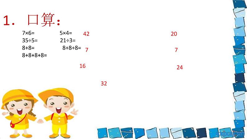 1.口算: 7×6= 5×4= 35÷5= 21÷3= 8+8= 8+8+8= 8+8+8+8=