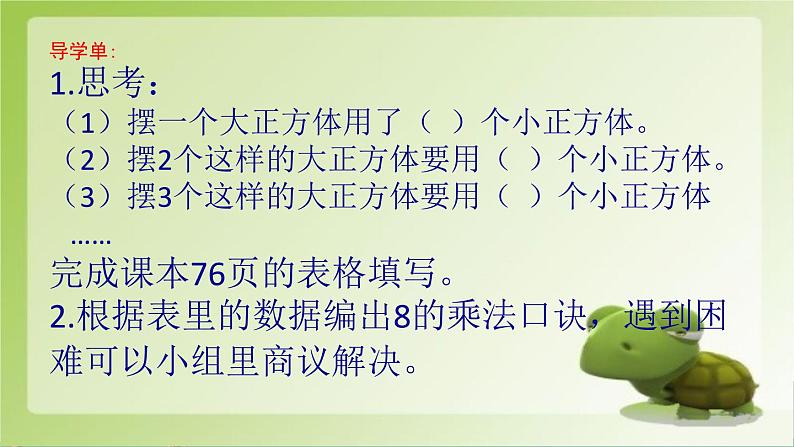 导学单:1.思考:(1)摆一个大正方体用了( )个小正方体。(2)摆2个这样的大正方体要用( )个小正方体。(3)摆3个这样的大正方体要用( )个小正方体 ……完成课本76页的表格填写。2.根据表里的数据编出8的乘法口诀,遇到困难可以小组里商议解决。
