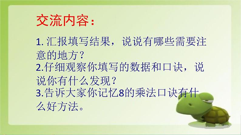 交流内容:1. 汇报填写结果,说说有哪些需要注意的地方?2.仔细观察你填写的数据和口诀,说说你有什么发现?3.告诉大家你记忆8的乘法口诀有什么好方法。
