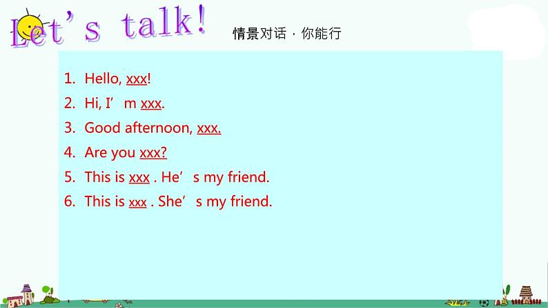 Hell, xxx!Hi, I’m xxx.Gd afternn, xxx.Are yu xxx?This is xxx . He’s my friend.This is xxx . She’s my friend.
