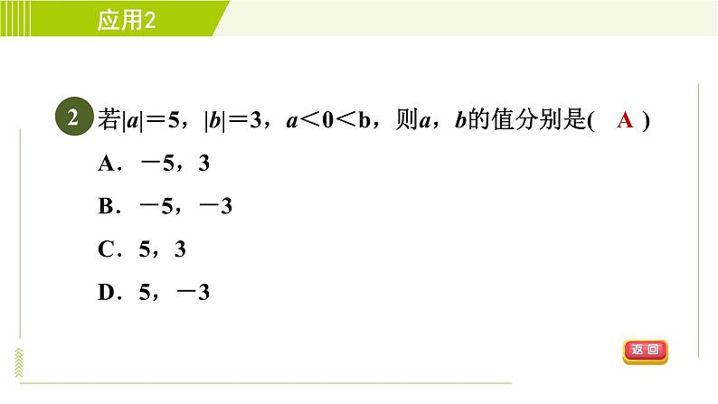 若|a|=5,|b|=3,a<0<b,则a,b的值分别是( )A.-5,3 B.-5,-3C.5,3 D.5,-3