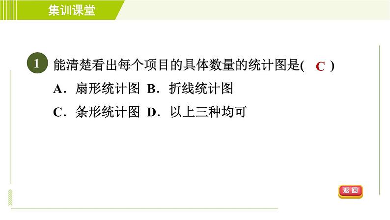 能清楚看出每个项目的具体数量的统计图是( )A.扇形统计图 B.折线统计图C.条形统计图 D.以上三种均可