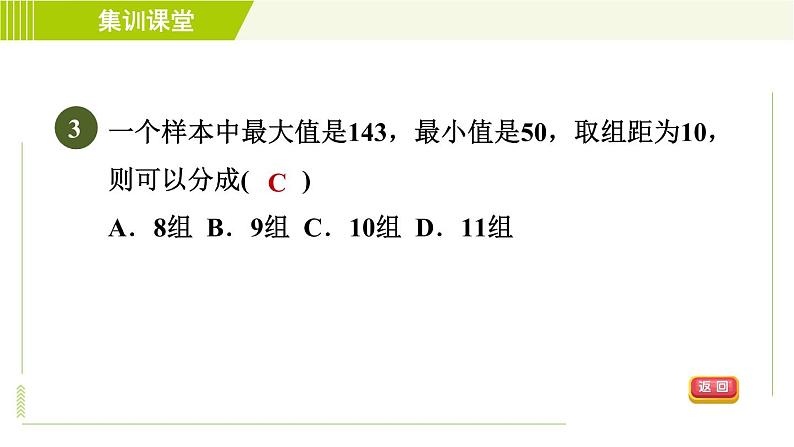 一个样本中最大值是143,最小值是50,取组距为10,则可以分成( )A.8组 B.9组 C.10组 D.11组