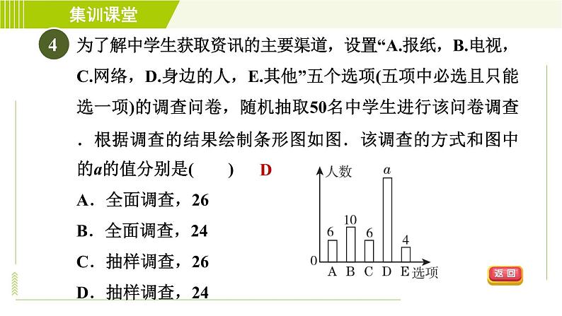 为了解中学生获取资讯的主要渠道,设置“A.报纸,B.电视,C.网络,D.身边的人,E.其他”五个选项(五项中必选且只能选一项)的调查问卷,随机抽取50名中学生进行该问卷调查.根据调查的结果绘制条形图如图.该调查的方式和图中的a的值分别是( )A.全面调查,26 B.全面调查,24C.抽样调查,26 D.抽样调查,24
