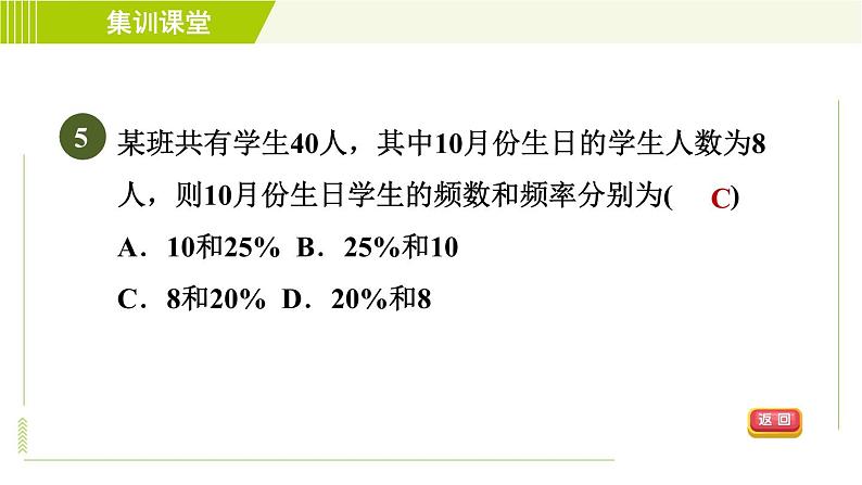 某班共有学生40人,其中10月份生日的学生人数为8人,则10月份生日学生的频数和频率分别为( )A.10和25% B.25%和10C.8和20% D.20%和8