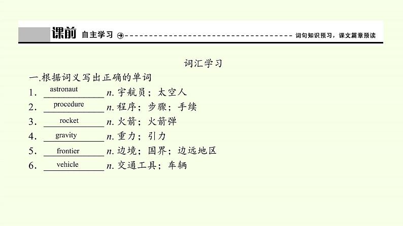 词汇学习一.根据词义写出正确的单词1.____________ n. 宇航员;太空人2.____________ n. 程序;步骤;手续3.____________ n. 火箭;火箭弹4.____________ n. 重力;引力5.____________ n. 边境;国界;边远地区6.____________ n. 交通工具;车辆