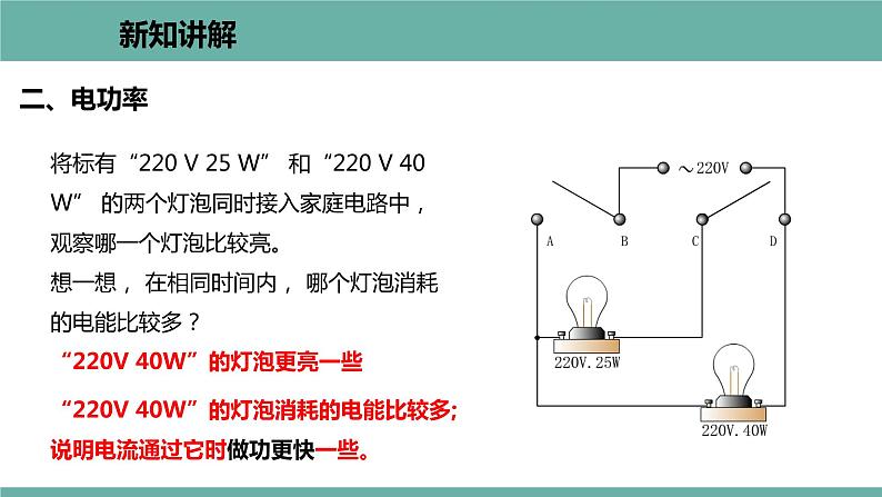 将标有“220 V 25 W” 和“220 V 40 W” 的两个灯泡同时接入家庭电路中, 观察哪一个灯泡比较亮。想一想, 在相同时间内, 哪个灯泡消耗的电能比较多?