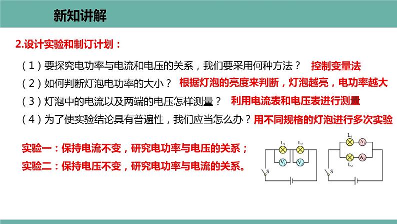 实验一:保持电流不变,研究电功率与电压的关系;实验二:保持电压不变,研究电功率与电流的关系。