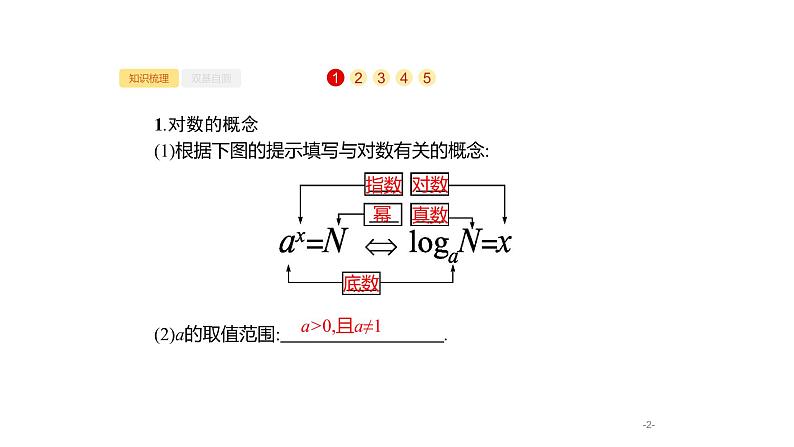 展开1.对数的概念(1)根据下图的提示填写与对数有关的概念:(2)a的取值范围: .
