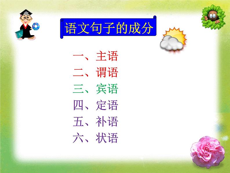 一、主语二、谓语三、宾语四、定语五、补语六、状语