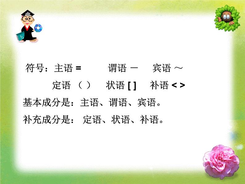 符号:主语 = 谓语 - 宾语 ~ 定语 ( ) 状语 [ ] 补语 < > 基本成分是:主语、谓语、宾语。 补充成分是: 定语、状语、补语。