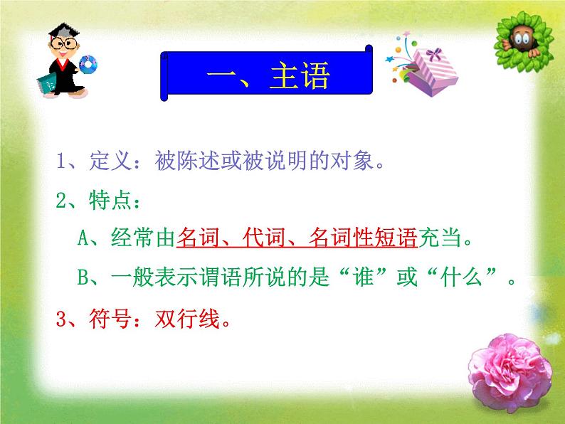 1、定义:被陈述或被说明的对象。2、特点: A、经常由名词、代词、名词性短语充当。 B、一般表示谓语所说的是“谁”或“什么”。3、符号:双行线。