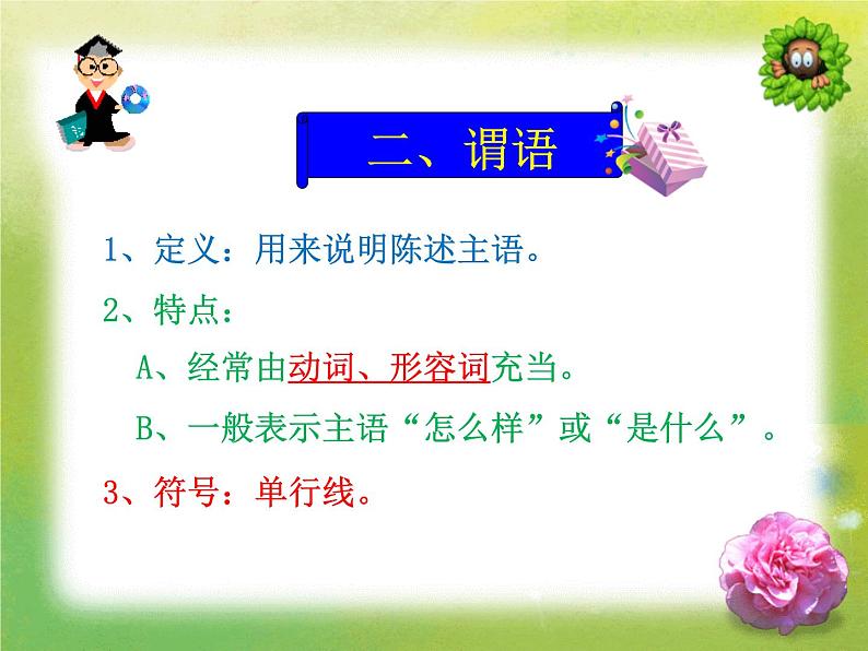 1、定义:用来说明陈述主语。2、特点: A、经常由动词、形容词充当。 B、一般表示主语“怎么样”或“是什么”。3、符号:单行线。