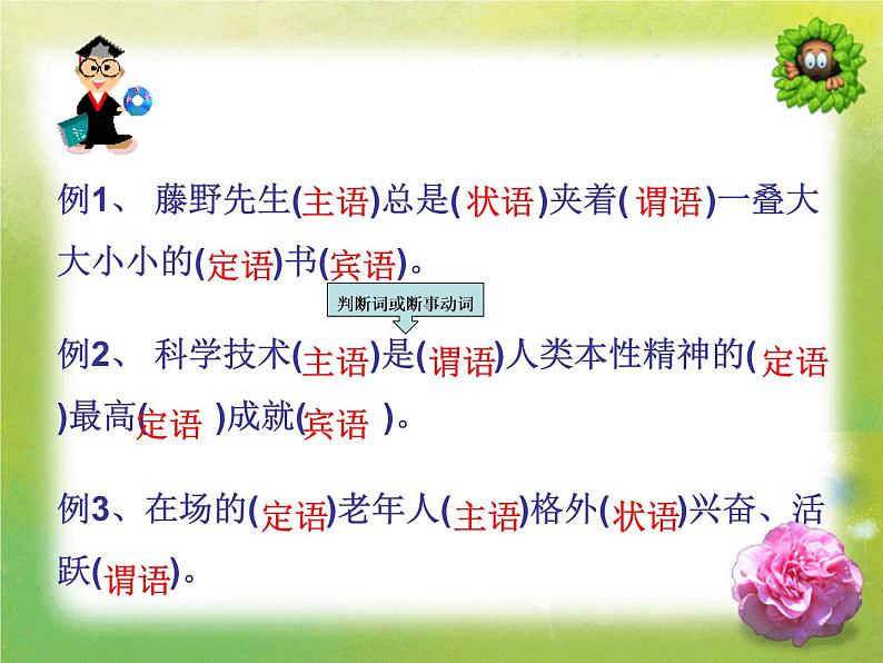 例1、 藤野先生( )总是( )夹着( )一叠大大小小的( )书( )。例2、 科学技术( )是( )人类本性精神的( )最高( )成就( )。例3、在场的( )老年人( )格外( )兴奋、活跃( )。