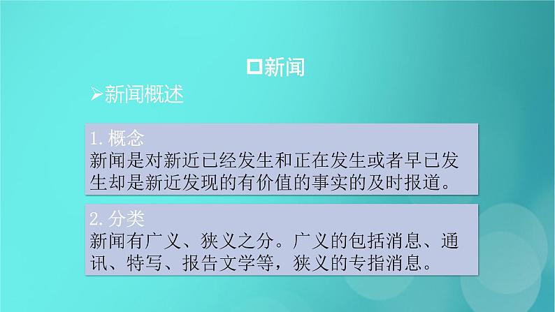 2.分类新闻有广义、狭义之分。广义的包括消息、通讯、特写、报告文学等,狭义的专指消息。