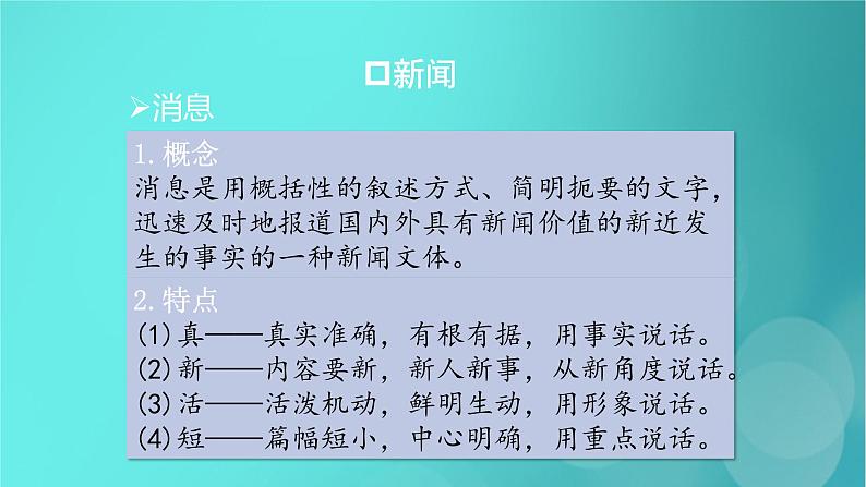2.特点(1)真——真实准确,有根有据,用事实说话。(2)新——内容要新,新人新事,从新角度说话。(3)活——活泼机动,鲜明生动,用形象说话。(4)短——篇幅短小,中心明确,用重点说话。