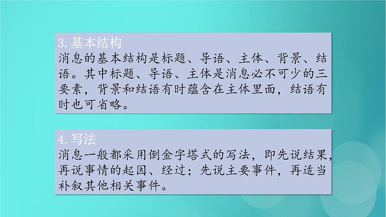 3.基本结构消息的基本结构是标题、导语、主体、背景、结语。其中标题、导语、主体是消息必不可少的三要素,背景和结语有时蕴含在主体里面,结语有时也可省略。