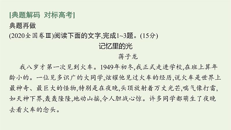 典题再做(2020全国卷Ⅲ)阅读下面的文字,完成1~3题。(15分)记忆里的光 蒋子龙我八岁才第一次见到火车。1949年初冬,我正式走进学校,在班上算年龄小的。一位见多识广的大同学,炫耀他见过火车的经历,说火车是世界上最神奇、最巨大的怪物,特别是在夜晚,头顶放射着万丈光芒,喘气像打雷,如天神下界,轰轰隆隆,地动山摇,令人胆战心惊。许多同学都萌生了夜晚去看火车的念头。
