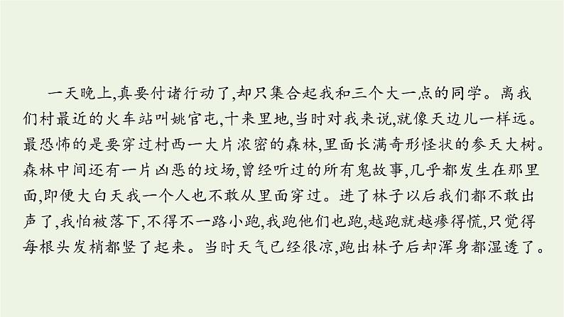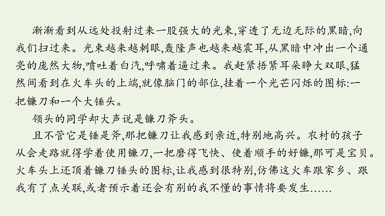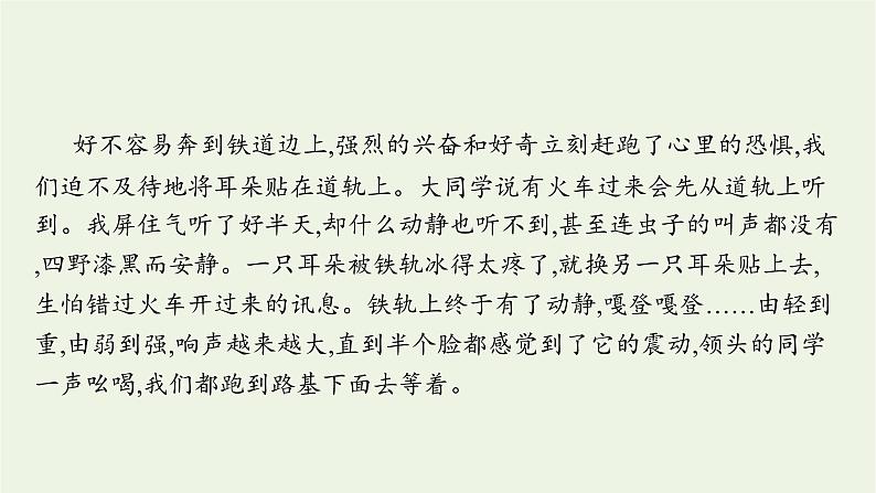 答案 ①萌生念头:大同学对火车形象的描述,让“我”萌生看火车的念头;②付诸行动:夜间穿过坟场,耳朵贴在铁轨上,写出“我”看火车时的兴奋与好奇;③抒发感受:火车头上挂着光芒闪烁的镰刀锤头图案,让“我”感到特别,也感到亲切。