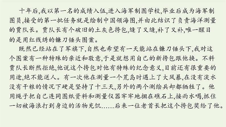 十年后,我以第一名的成绩入伍,进入海军制图学校,毕业后成为海军制图员,接受的第一批任务就是绘制中国领海图,并由此结识了负责海洋测量的贾队长。贾队长有个破旧的土灰色挎包,缝了又缝,补了又补,唯一醒目的是用红线绣的镰刀锤头图案。既然已经站在了军旗下,自然也希望有一天能站在镰刀锤头下,我对这个图案有一种特殊的亲近和敬意,于是就想用自己的新挎包跟他换。不料贾队长断然拒绝,他说这个挎包对他有特殊的纪念意义,目前还有很重要的用途,绝不能送人。有一次他在测量一个荒岛时遇上了大风暴,在没有淡水没有干粮的情况下硬是坚持了十三天,另外的两个测绘兵却都牺牲了。他用绳子把自己连同图纸资料和测量仪器牢牢地捆在礁石上,接雨水喝,抓住一切被海浪打到身边的活物充饥……后来一位老首长把这个挎包奖给了他。