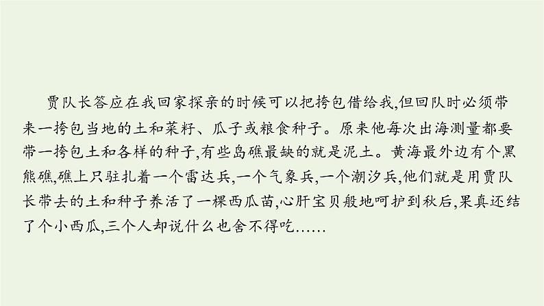 贾队长答应在我回家探亲的时候可以把挎包借给我,但回队时必须带来一挎包当地的土和菜籽、瓜子或粮食种子。原来他每次出海测量都要带一挎包土和各样的种子,有些岛礁最缺的就是泥土。黄海最外边有个黑熊礁,礁上只驻扎着一个雷达兵,一个气象兵,一个潮汐兵,他们就是用贾队长带去的土和种子养活了一棵西瓜苗,心肝宝贝般地呵护到秋后,果真还结了个小西瓜,三个人却说什么也舍不得吃……