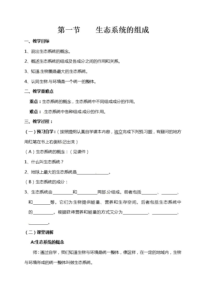 师:通过自学,我们知道生物与环境是统一整体,像这样,在一定的地域内,生物与环境形成的统一整体叫做生态系统。