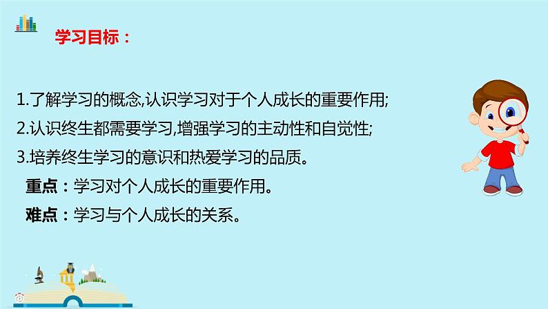 1.了解学习的概念,认识学习对于个人成长的重要作用;2.认识终生都需要学习,增强学习的主动性和自觉性;3.培养终生学习的意识和热爱学习的品质。 重点:学习对个人成长的重要作用。 难点:学习与个人成长的关系。