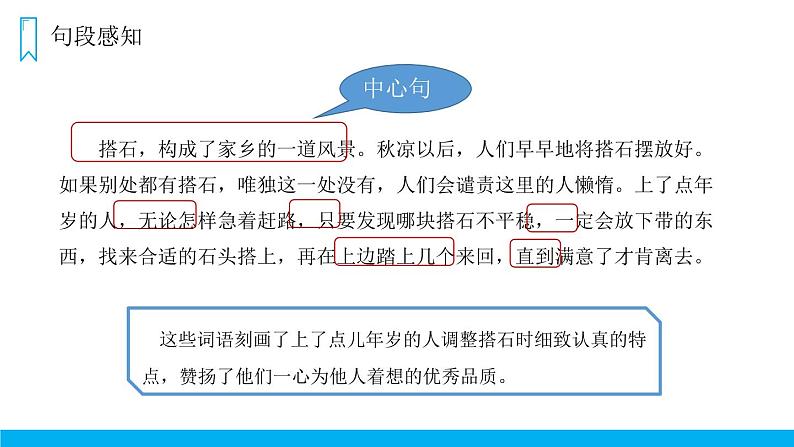 这些词语刻画了上了点儿年岁的人调整搭石时细致认真的特点,赞扬了他们一心为他人着想的优秀品质。