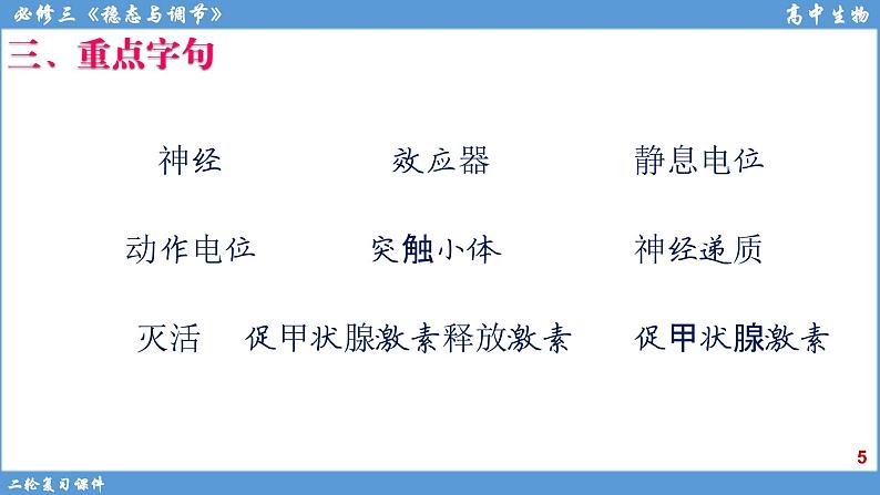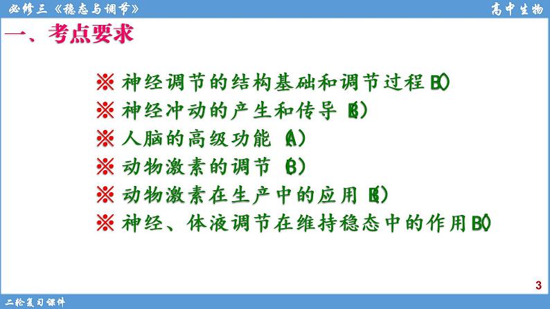 神经调节的结构基础和调节过程(B) 神经冲动的产生和传导(B) 人脑的高级功能(A)动物激素的调节(B) 动物激素在生产中的应用(B) 神经、体液调节在维持稳态中的作用(B)