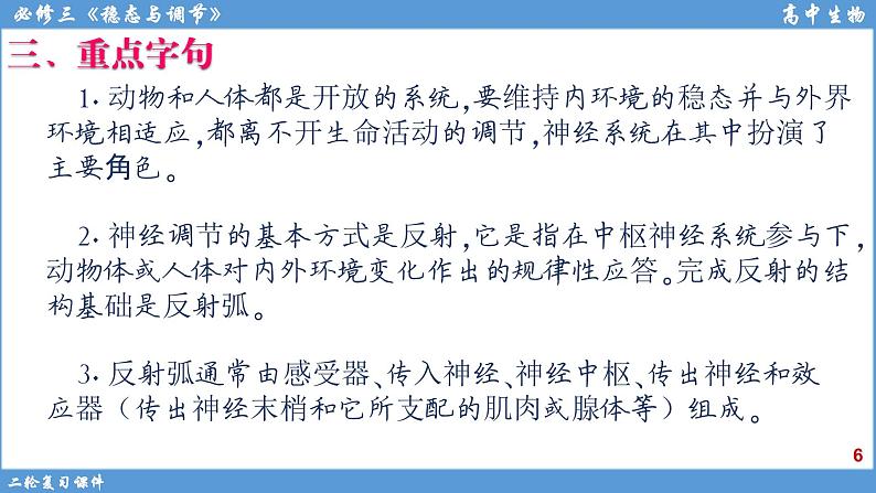 2.神经调节的基本方式是反射,它是指在中枢神经系统参与下,动物体或人体对内外环境变化作出的规律性应答。完成反射的结构基础是反射弧。