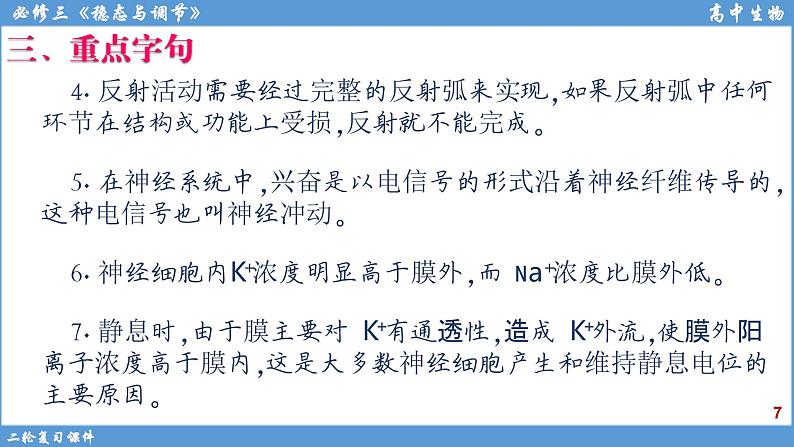 6.神经细胞内K+浓度明显高于膜外,而Na+浓度比膜外低。