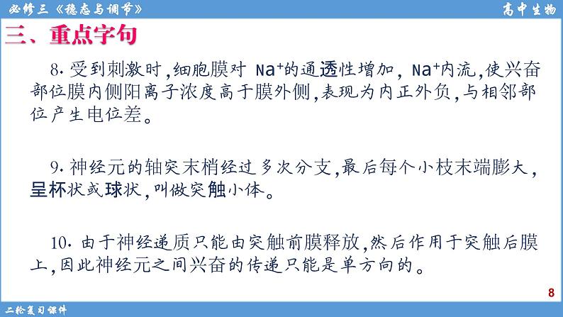 8.受到刺激时,细胞膜对Na+的通透性增加,Na+内流,使兴奋部位膜内侧阳离子浓度高于膜外侧,表现为内正外负,与相邻部位产生电位差。