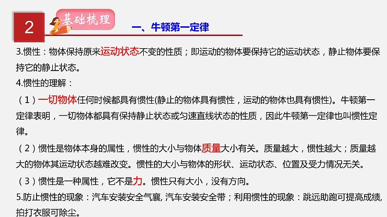 3.惯性:物体保持原来运动状态不变的性质;即运动的物体要保持它的运动状态,静止物体要保持它的静止状态。4.惯性的理解:(1)一切物体任何时候都具有惯性(静止的物体具有惯性,运动的物体也具有惯性)。牛顿第一定律表明,一切物体都具有保持静止状态或匀速直线状态的性质,因此牛顿第一定律也叫惯性定律。(2)惯性是物体本身的属性,惯性的大小与物体质量大小有关。质量越大,惯性越大;质量越大的物体其运动状态越难改变。惯性的大小与物体的形状、运动状态、位置及受力情况无关。(3)惯性是一种属性,它不是力。惯性只有大小,没有方向。5.防止惯性的现象:汽车安装安全气襄, 汽车安装安全带;利用惯性的现象:跳远助跑可提高成绩, 拍打衣服可除尘。