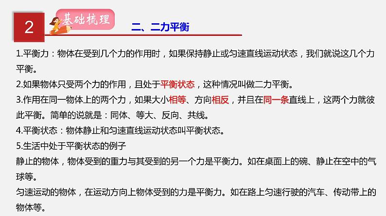 1.平衡力:物体在受到几个力的作用时,如果保持静止或匀速直线运动状态,我们就说这几个力平衡。2.如果物体只受两个力的作用,且处于平衡状态,这种情况叫做二力平衡。3.作用在同一物体上的两个力,如果大小相等、方向相反,并且在同一条直线上,这两个力就彼此平衡。简单的说就是:同体、等大、反向、共线。4.平衡状态:物体静止和匀速直线运动状态叫平衡状态。5.生活中处于平衡状态的例子静止的物体,物体受到的重力与其受到的另一个力是平衡力。如在桌面上的碗、静止在空中的气球等。匀速运动的物体,在运动方向上物体受到的力是平衡力。如在路上匀速行驶的汽车、传动带上的物体等。