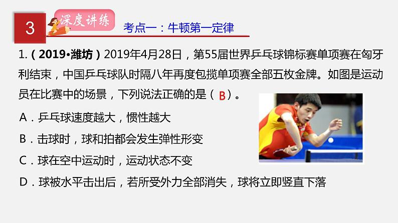 1.(2019·潍坊)2019年4月28日,第55届世界乒乓球锦标赛单项赛在匈牙利结束,中国乒乓球队时隔八年再度包揽单项赛全部五枚金牌。如图是运动员在比赛中的场景,下列说法正确的是( )。