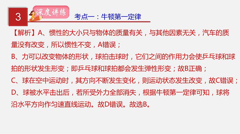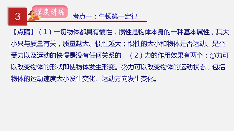 【点睛】(1)一切物体都具有惯性,惯性是物体本身的一种基本属性,其大小只与质量有关,质量越大、惯性越大;惯性的大小和物体是否运动、是否受力以及运动的快慢是没有任何关系的。(2)力的作用效果有两个:①力可以改变物体的形状即使物体发生形变。②力可以改变物体的运动状态,包括物体的运动速度大小发生变化、运动方向发生变化。