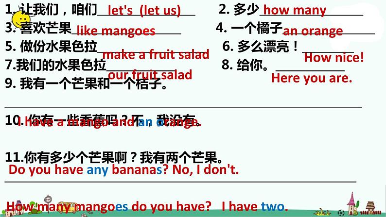 1. 让我们,咱们_________________ 2. 多少__________________3. 喜欢芒果___________________ 4. 一个橘子________________5. 做份水果色拉___________________ 6. 多么漂亮!_________7.我们的水果色拉____________ 8. 给你。____________9. 我有一个芒果和一个桔子。______________________________________________________________10. 你有一些香蕉吗?不,我没有。11.你有多少个芒果啊?我有两个芒果。_____________________________________________________________
