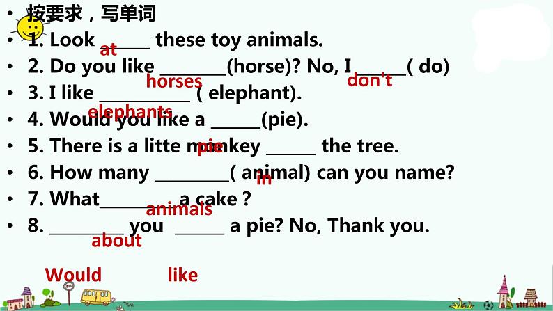 按要求,写单词1. Lk ______ these ty animals. 2. D yu like ________(hrse)? N, I ______( d)3. I like ___________ ( elephant).4. Wuld yu like a ______(pie).5. There is a litte mnkey ______ the tree.6. Hw many _________( animal) can yu name?7. What_________ a cake?8. _________ yu ______ a pie? N, Thank yu.