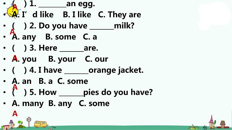 ( ) 1. ________an egg. A. I’d like B. I like C. They are( ) 2. D yu have _______milk? A. any B. sme C. a( ) 3. Here _______are. A. yu B. yur C. ur( ) 4. I have _______range jacket. A. an B. a C. sme( ) 5. Hw _______pies d yu have? A. many B. any C. sme