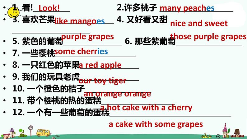1. 看!__________ 2.许多桃子 ____________________3. 喜欢芒果________________ 4. 又好看又甜_____________________5. 紫色的葡萄________________ 6. 那些紫葡萄__________________7. 一些樱桃______________________ 8. 一只红色的苹果________________9. 我们的玩具老虎________________10. 一个橙色的桔子__________________11. 带个樱桃的热的蛋糕____________________12. 一个有一些葡萄的蛋糕_________________________________