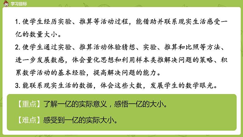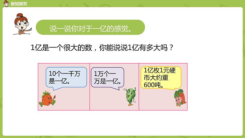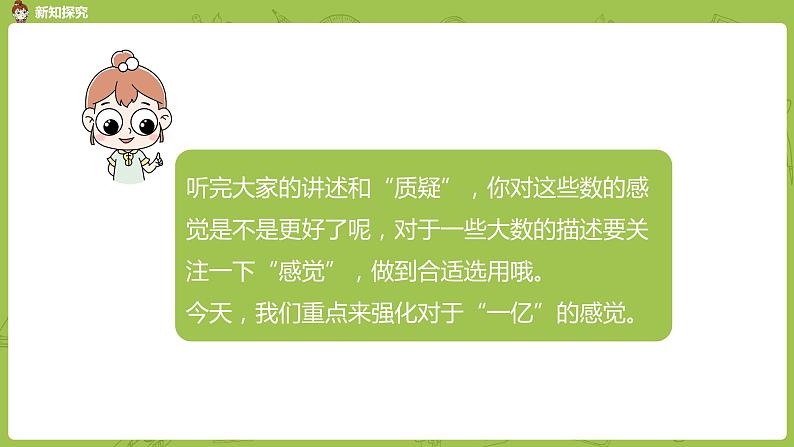 听完大家的讲述和“质疑”,你对这些数的感觉是不是更好了呢,对于一些大数的描述要关注一下“感觉”,做到合适选用哦。今天,我们重点来强化对于“一亿”的感觉。