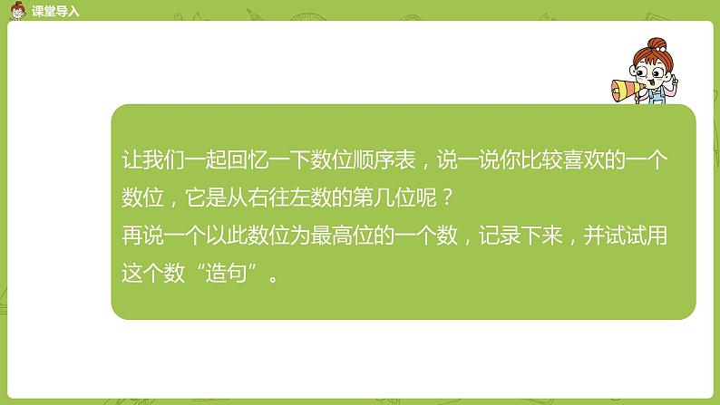 让我们一起回忆一下数位顺序表,说一说你比较喜欢的一个数位,它是从右往左数的第几位呢?再说一个以此数位为最高位的一个数,记录下来,并试试用这个数“造句”。
